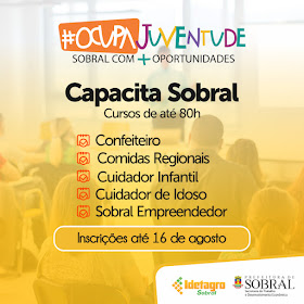 A Prefeitura de Sobral, por meio da Secretaria do Trabalho e Desenvolvimento Econômico (STDE), abriu as inscrições para cursos do projeto Capacita Sobral, que integra o programa #ocupaJuventude. Serão ofertados os cursos de “Confeiteiro”, “Comidas regionais”, “Cuidador infantil”, “Cuidador de idoso” e “Sobral empreendedor”. As inscrições acontecem de 5 a 16 de agosto de 2019.